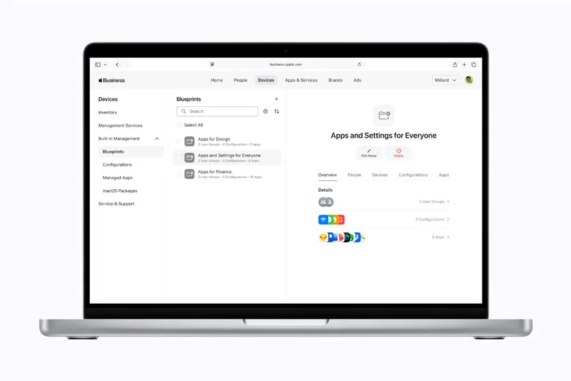 Melalui fitur Blueprint, bisnis dapat menyiapkan perangkat dengan konfigurasi dan aplikasi yang sudah ditentukan sebelumnya. Cara ini membantu menjaga konsistensi, meningkatkan keamanan, dan mendukung zero-touch deployment, sehingga perangkat Apple baru bisa langsung digunakan sejak pertama kali dikeluarkan dari kotak.