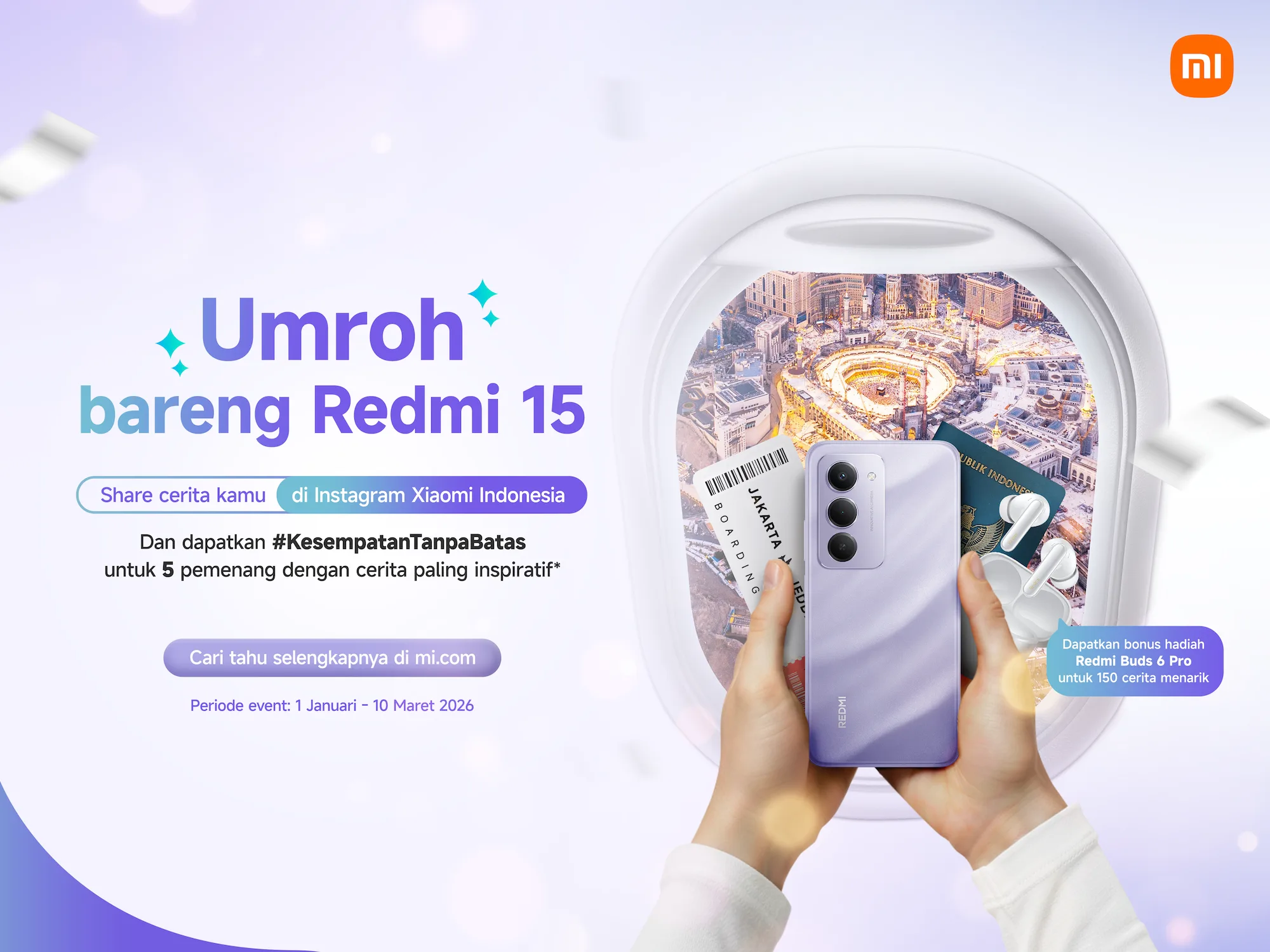 Bagikan Kisah Inspiratif: Unggah foto atau video kreatif di Instagram. Ceritakan bagaimana REDMI 15 mendukung produktivitasmu, atau alasan emosional mengapa kamu ingin menghadiahkan paket Umrah tersebut kepada sosok spesial.