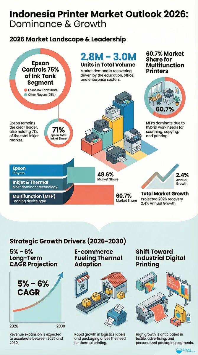 Pasar printer Indonesia dari tahun 2026 hingga 2030 diperkirakan tumbuh stabil pada CAGR ~5–6%, dengan printer digital industri, format lebar, dan printer kantor multifungsi sebagai penggerak utama.