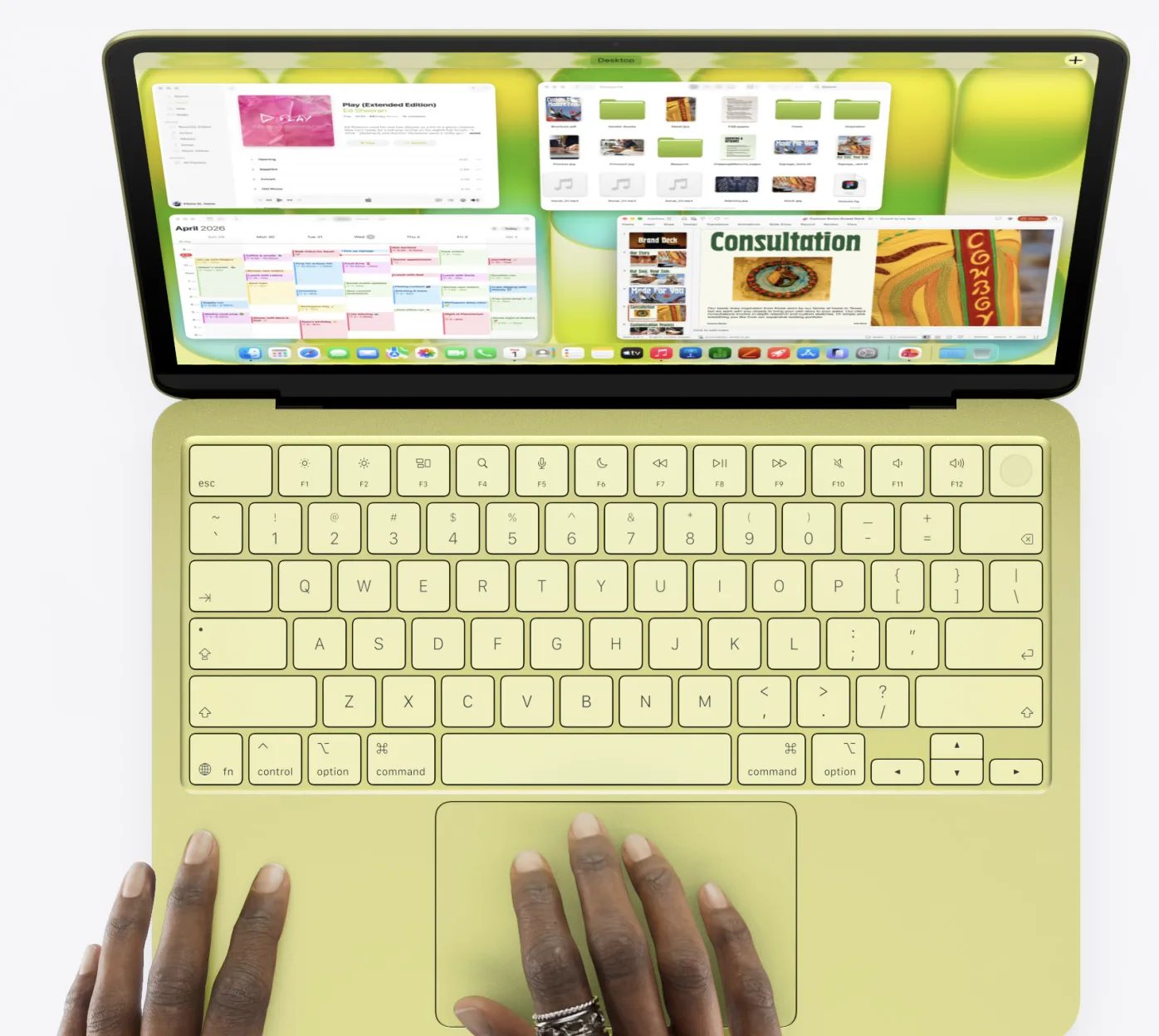 Aksen warna ini diaplikasikan secara senada (color-matched) hingga ke bagian Magic Keyboard dan wallpaper bawaan perangkat. Untuk menekan harga, Apple menghilangkan fitur lampu latar (backlight) pada keyboard, namun tetap mempertahankan Multi-Touch trackpad berukuran lapang yang menjadi ciri khas Mac.