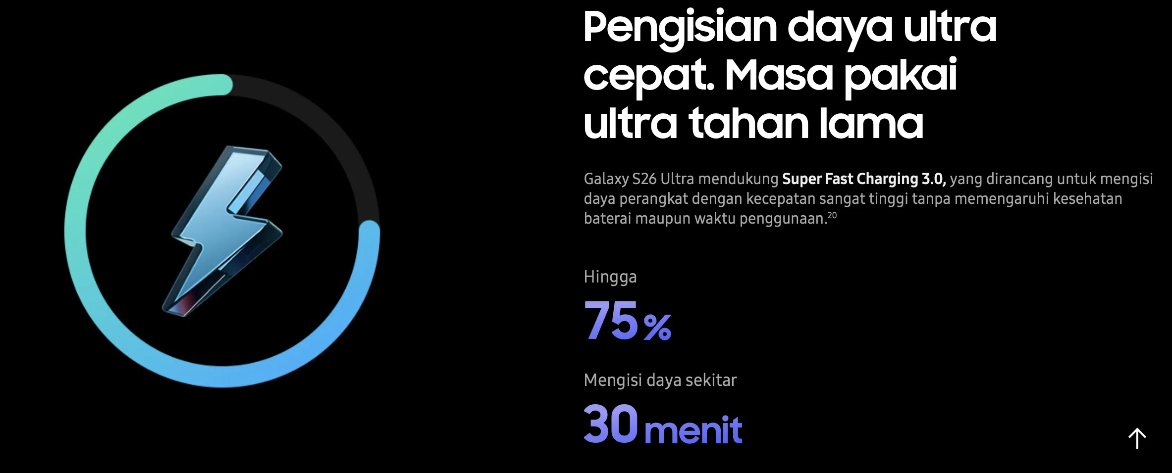 Berkat teknologi Super-Fast Charging 3.0 (60W Super Fast Charging), daya baterai dapat terisi dari 0 hingga 75% hanya dalam waktu 30 menit.